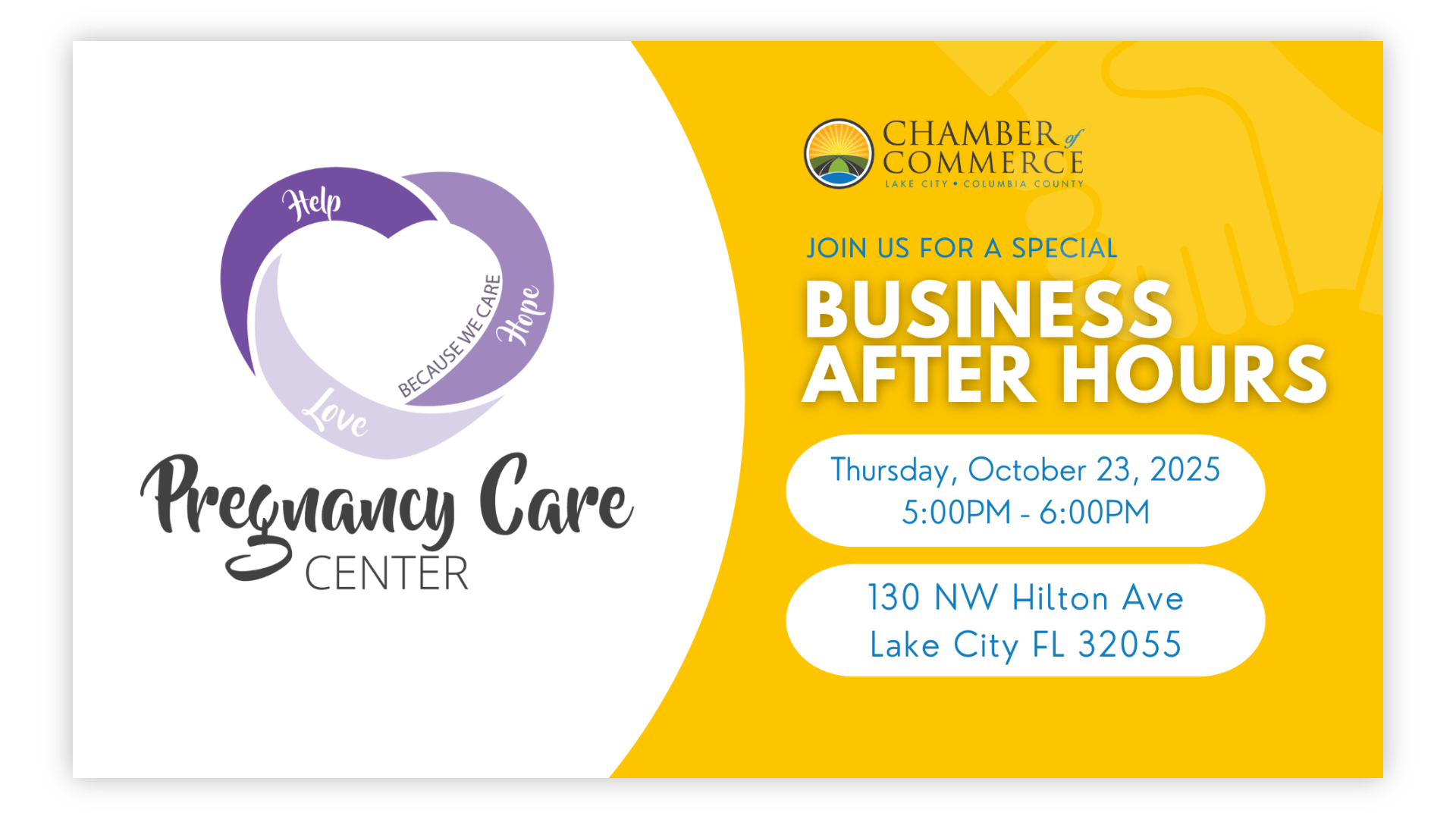 You're invited to the October "Business After Hours" networking event hosted by Pregnancy Care Center on October 23, 2025 from 5:00PM - 6:00PM!